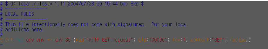 - ex) (msg:"HTTP GET request"; sid:1000001; rev:1; content:"GET"; nocase;)