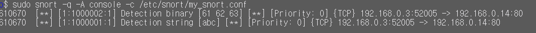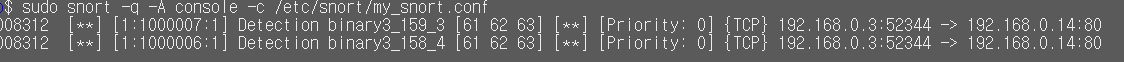 alert tcp any any -> any 80 (msg:"Detection binary [61 62 63]"; sid:1000002; rev:1; content:"|61 62 63|"; nocase;)
