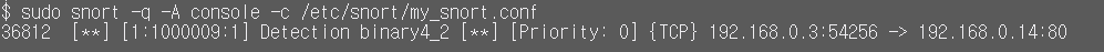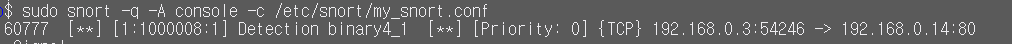 /var/log/snort 의 alert 파일에 local rule의 규칙에 의한 alert 가 생긴 것을 알 수 있다.