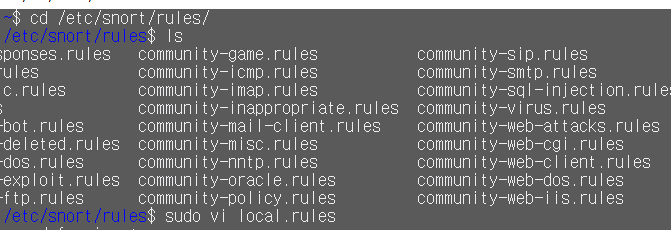스노트 규칙들은 /etc/snort/rules에 있는데 이중에서 local.rules에 우리만의 규칙을 적을 수 있다.