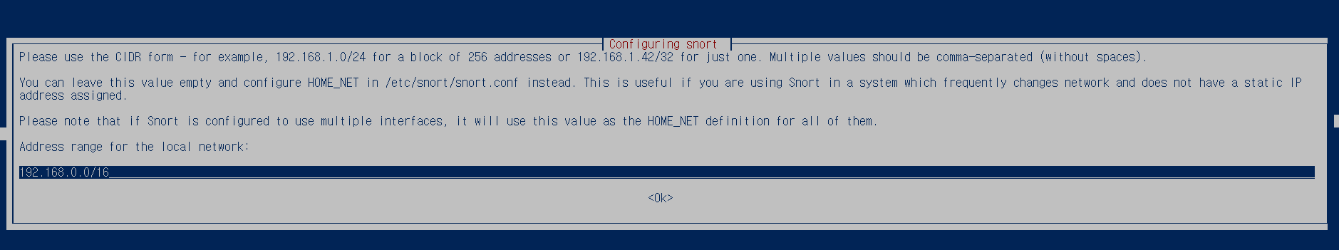 설치 과정 중 위와같이 네트워크 대역을 입력해야 하는데 나는 기본적으로 주어지는 것을 선택했다.